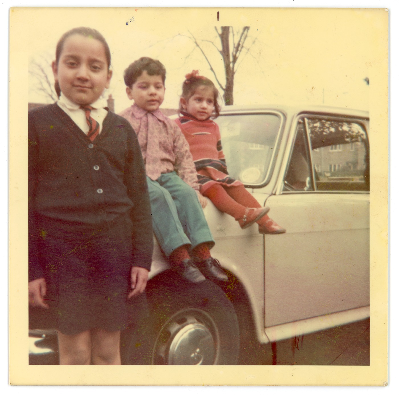 Three children pose in front of a car.