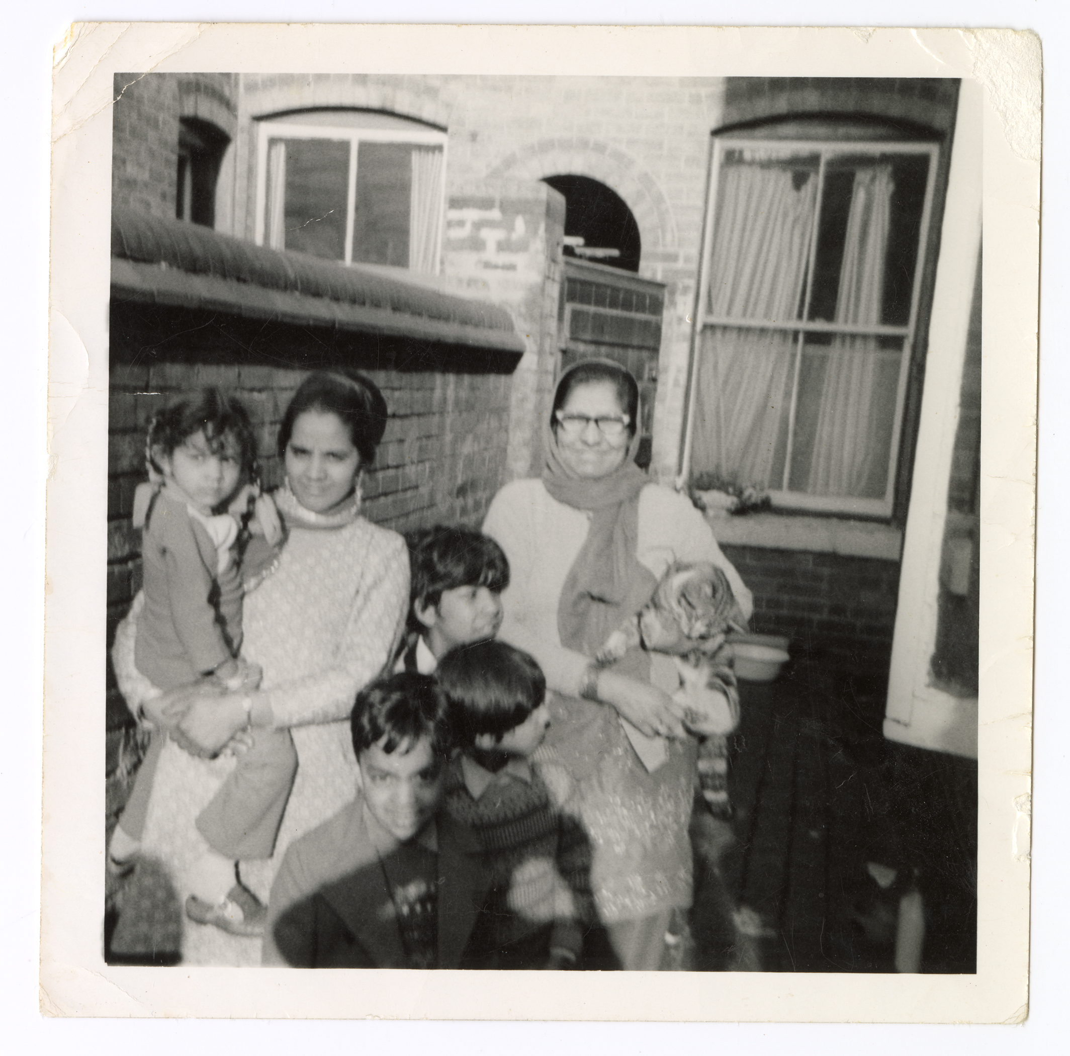 A family pose with children and a pet cat in front of a Victorian terraced house. Taken as part of a family visit in Birmingham.