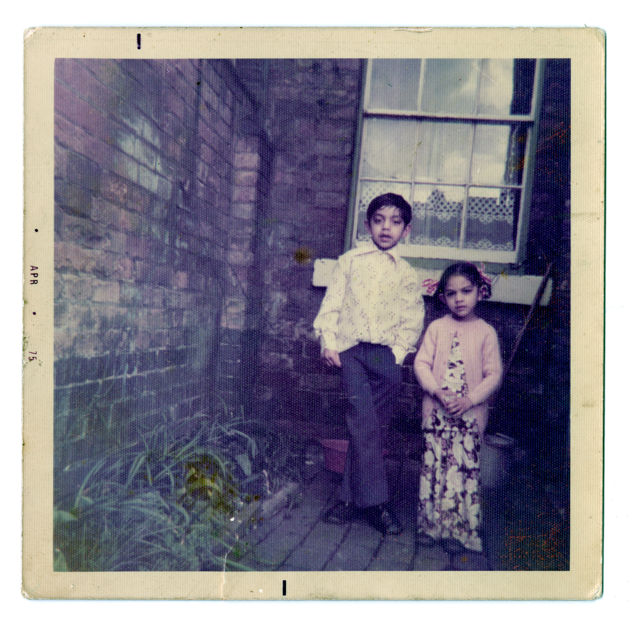 Two children pose in the garden of a Victorian terrace house in Normanton, Derby.