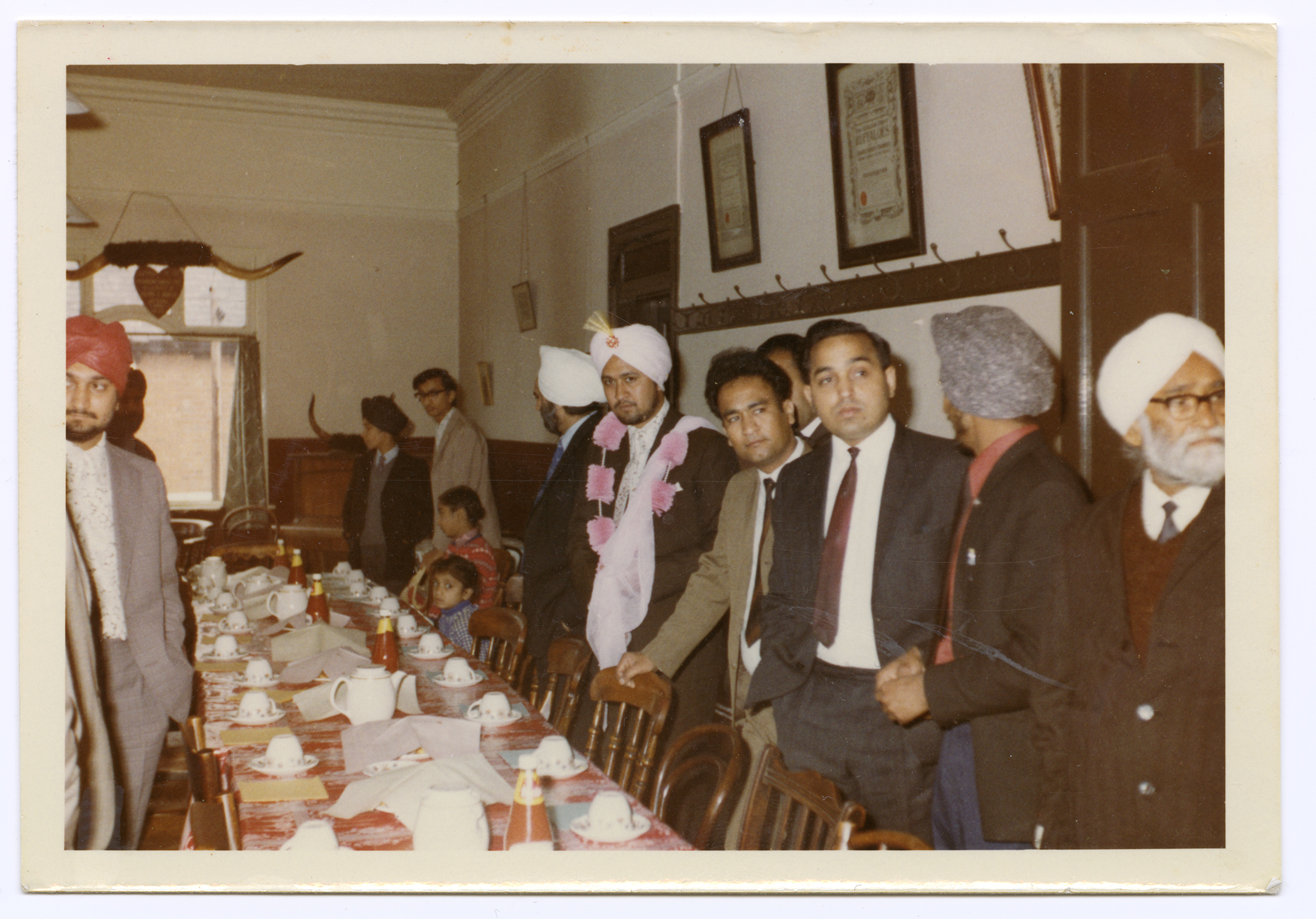 A group of people get ready to sit at a wedding meal in Wolverhampton.